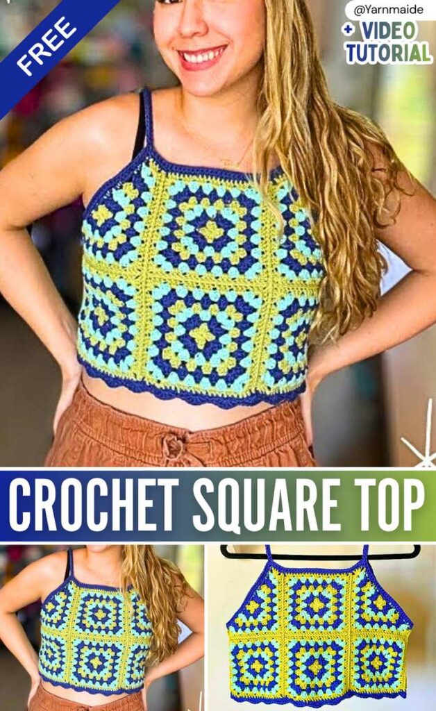 This is a colorful top you must crochet for summer. Make 8 such squares and four triangles for standard size.