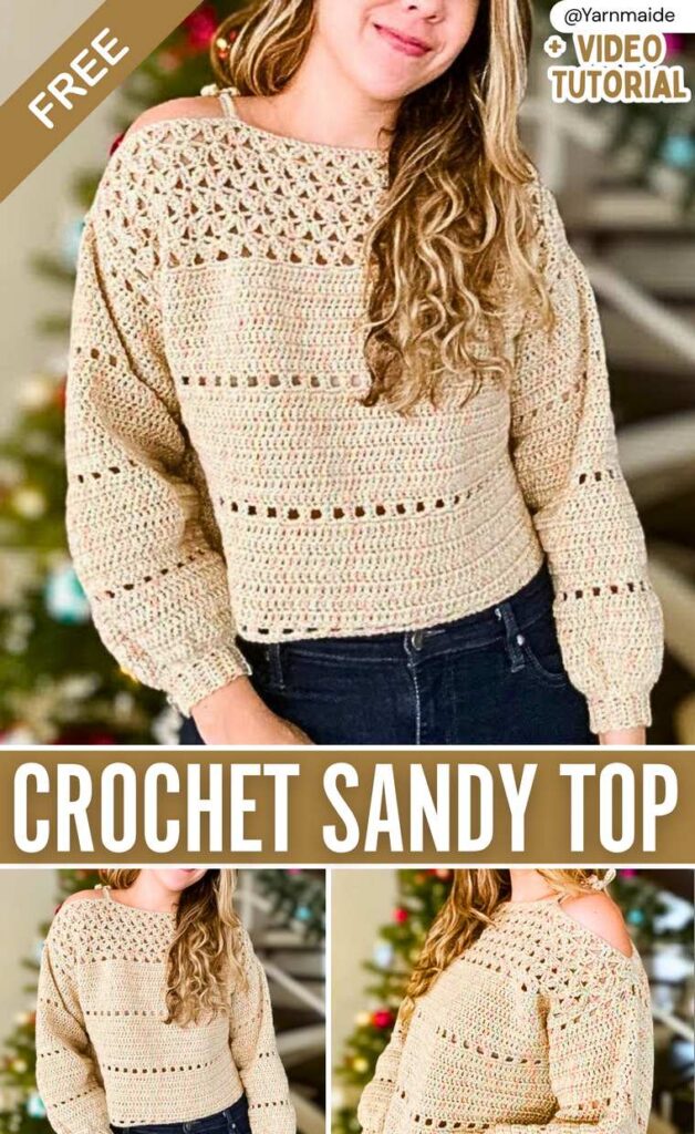 Looking for a crochet top for formal wear? This full-sleeve top crocheted with both lighter and bulkier yarn in sandy color is not to be missed, especially for Christmas. You can definitely choose other colors, like aqua or baby pink.