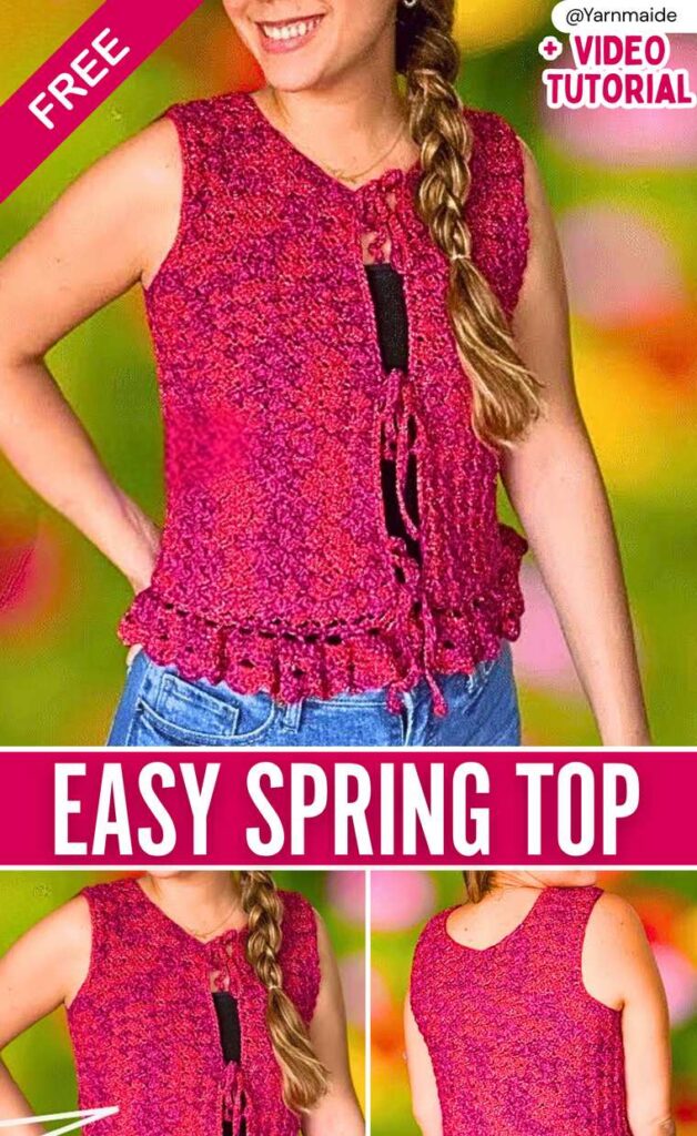 Spring tops should be colorful and not overly warm. This crochet sleeveless, fitted top fulfills both needs and can be crocheted using an 8-row repeat pattern.