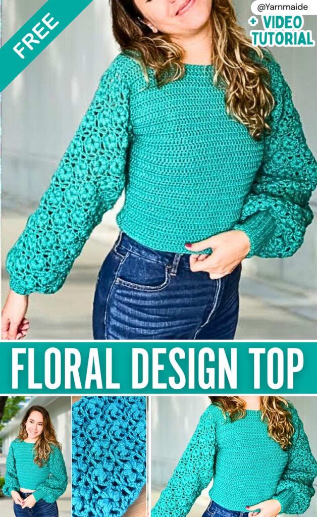 The Dreaming in Flowers top has voluminous “flower power” sleeves, cuffs, and a solid stitch body. This will be a fitted crochet top for an average size medium, but it includes instructions for customization to other sizes.
