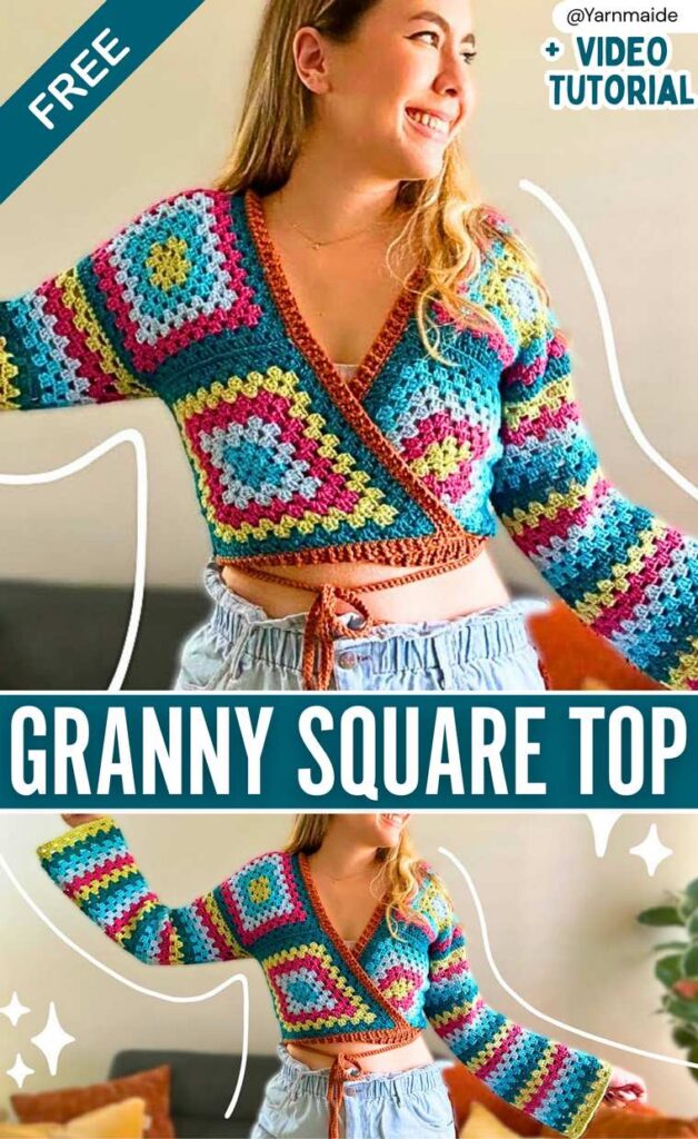 This full-sleeved, colorful, and wrap-around crochet top is one of the most versatile in body dimensions and type. You can crochet the stripes in sleeves in your own choice of colors and adjust the number of squares, too.